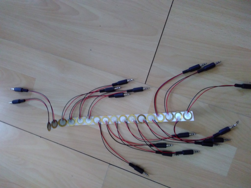 So I also fixed 40 piezo discs to the minijack connectors, and stuck them to my keys, and connected it all, and was happy getting a sound for most keys, with a good signal and all.