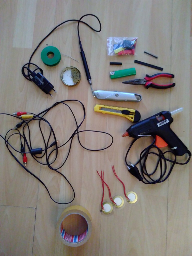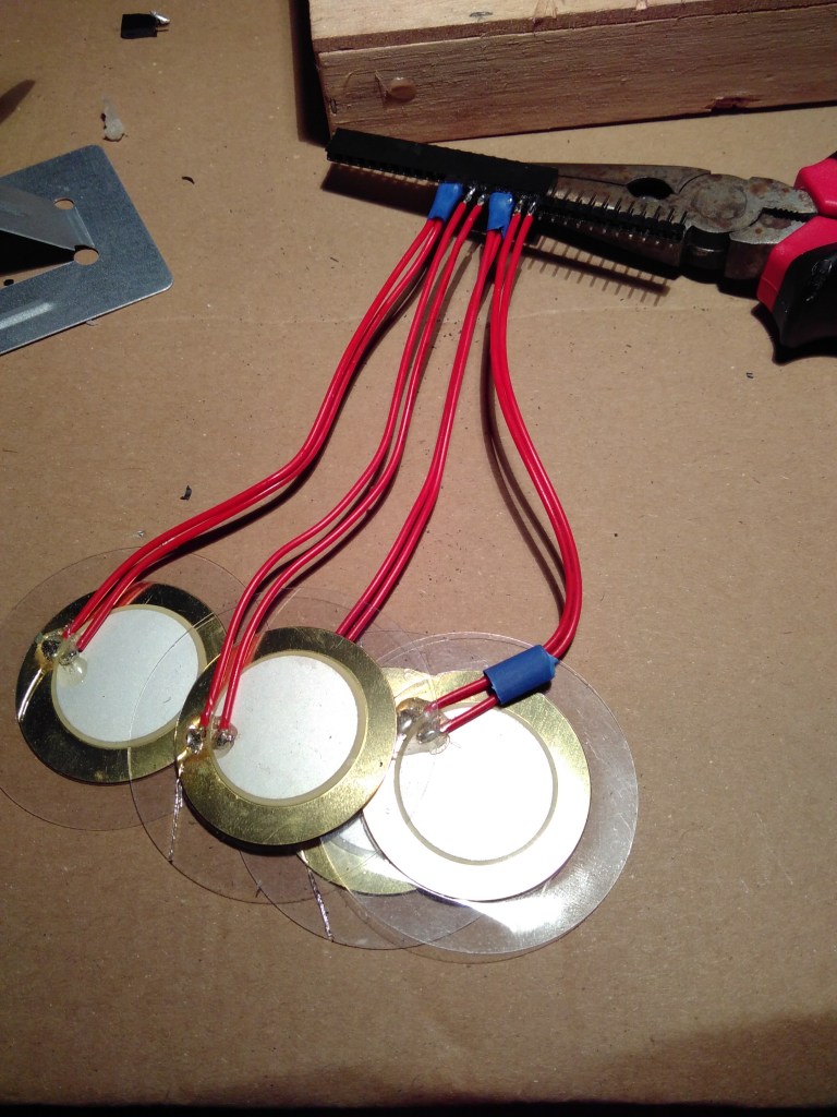 Piezo discs of 20mm, breadboard and Dupont connectors, an old RCA cable, and I could plug it into my mixer.